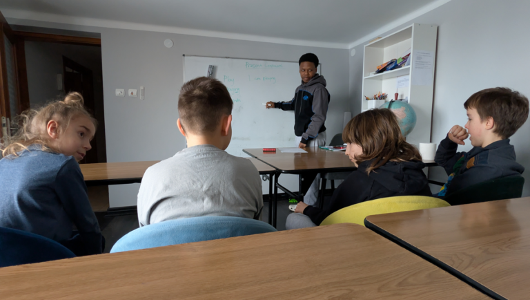Kiedy przy tablicy staje ktoś, dla kogo angielski jest naturalnym językiem komunikacji, a nie tematem lekcji — zmienia się wszystko. Nasze dzieci rozmawiają, pytają, próbują, śmieją się z własnych błędów i próbują jeszcze raz. Nie mówią po angielsku, bo takie jest zadanie domowe. Mówią, bo chcą się dogadać. Bo chcą zrozumieć, co Ramsey pisze na tablicy przy „Present Continuous”. Bo chcą zagrać w szachy lub rysować z Precious. To jest naturalne zanurzenie w języku — i to jest najlepsza lekcja, jaką możemy im dać.